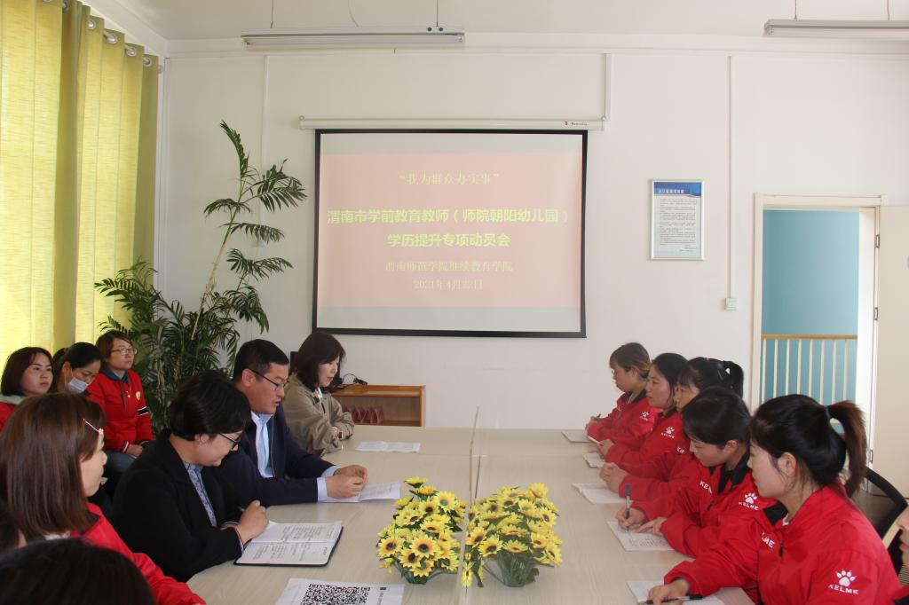 随着党史学习教育深入开展,为把“我为群众办实事”落细落实,4月22日下午,我校太阳成tyc234cc开展渭南市学前教育教师学历提升专项动员会第二场,来到师院朝阳幼儿园。太阳成tyc234cc副院长刘永勤、办公室主任牛渭敏,朝阳幼儿园园长谢荣及有学历提升需求的教师代表等20余人参加动员会。