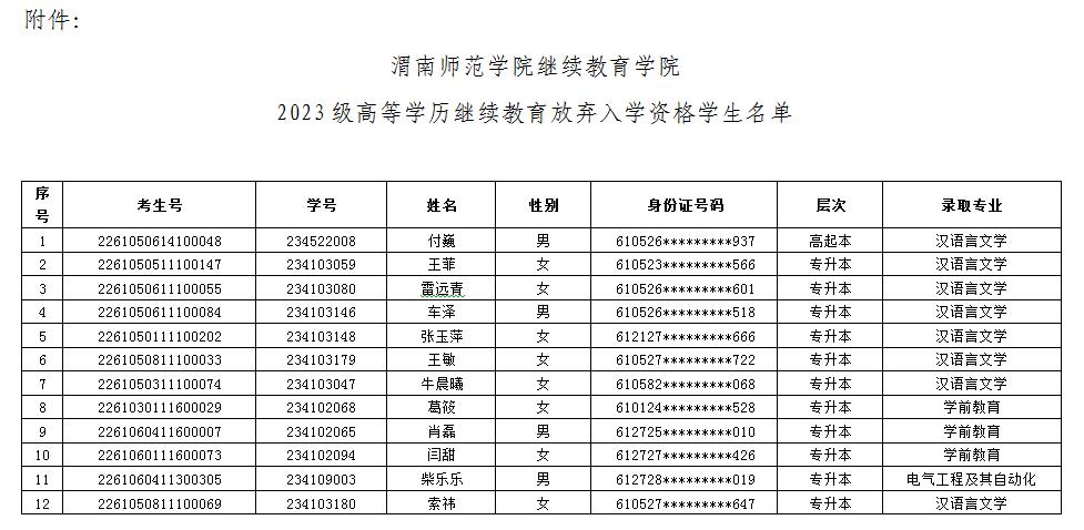 根据《普通高等学校学生管理规定》(中华人民共和国教育部令第41号)第三章第八条、《太阳成城集团tyc234cc高等学历继续教育学生管理办法》第三章第九条的规定,对付巍等12名新生作放弃入学资格处理(名单附后)。公告结束后,将报教育部学信网作放弃入学资格处理,标注放弃入学资格的不能申请恢复学籍。